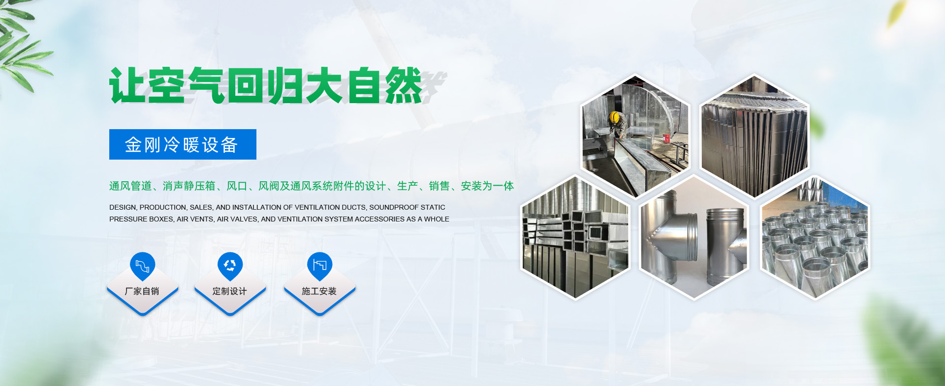 重慶金剛冷暖設(shè)備有限公司是集通風(fēng)管道、消聲靜壓箱、風(fēng)口、風(fēng)閥及通風(fēng)系統(tǒng)附件的設(shè)計、生產(chǎn)、銷售、安裝為一體的專業(yè)企業(yè)。擁有日生產(chǎn)、加工鍍鋅板、不銹鋼板、各型機制風(fēng)管3000平方米的能力。我司產(chǎn)品形式多樣,結(jié)構(gòu)新穎,連接牢靠,強度高、密封性好,符合規(guī)范、節(jié)省投資、安裝方便,能夠滿足廣大客戶的各種要求。公司堅持以“卓越、創(chuàng)新、快捷、誠信”的服務(wù)理念,為廣大客戶提供高質(zhì)、高效、方便的服務(wù)。在完建的工程中取得了廣大客戶的一致好···